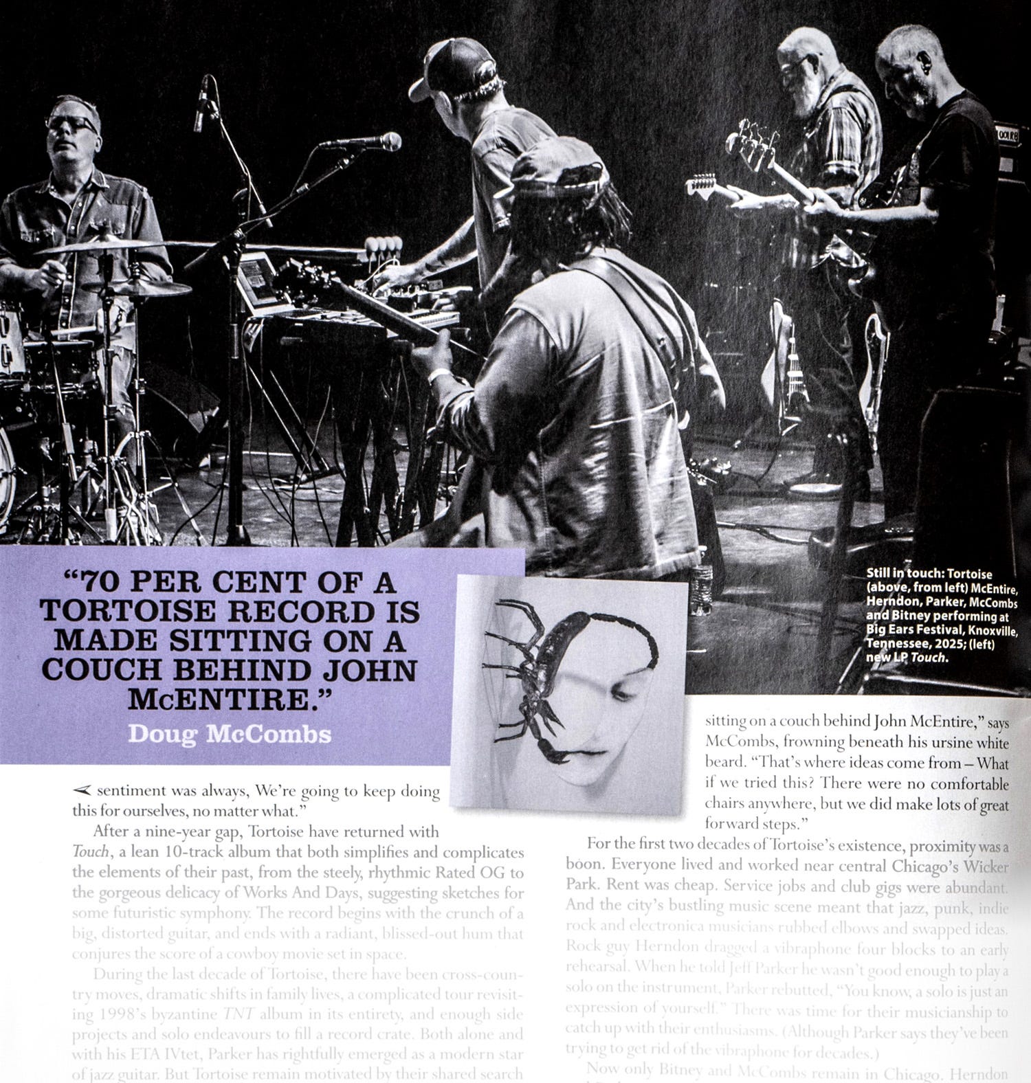 A photo from March’s Big Ears Festival coverage leads a print feature on Tortoise in MOJO Magazine: